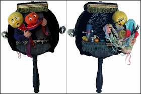 This is what my desktop looked like when I was making the original portrait rattles and I am sad to say that it hasn't changed to much, other than being a little messier. I very seldom draw, I much prefer to work out all of the problems as the piece is being built. I know what I want but I am also totally open to be directed by the art work itself. Drawing for me is boring. If I do draw it is a rough thumbnail sketch and that is about all. I look at my work as assemblage because it is influenced by what is at hand on my desk or what I have in my bins of goodies.